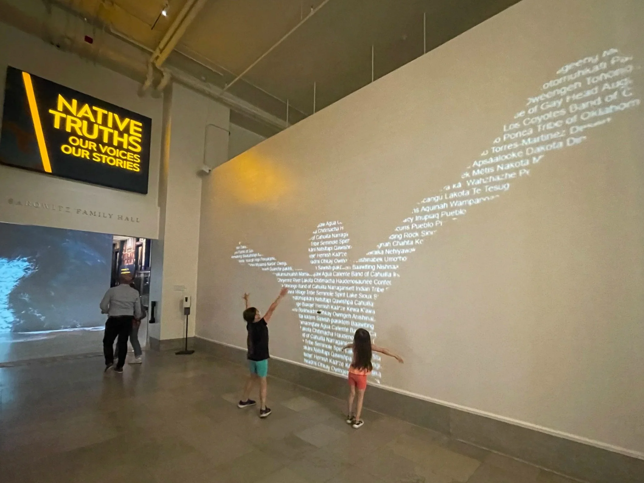 Imagine Koasati words illuminating the moving silhouette of children walking through a corridor on their way to kids quest, or a grandparent en route to seven clans. The interaction then speaking the words in an ambient sonic texture, echoing the voices of Coushatta elders. Words of welcome, words of hope, words of luck. This example was created for The Field Museum in Chicago, Illinois and features the voice of Virginia Langley Benavente (Turkey Clan) speaking in Koasati.